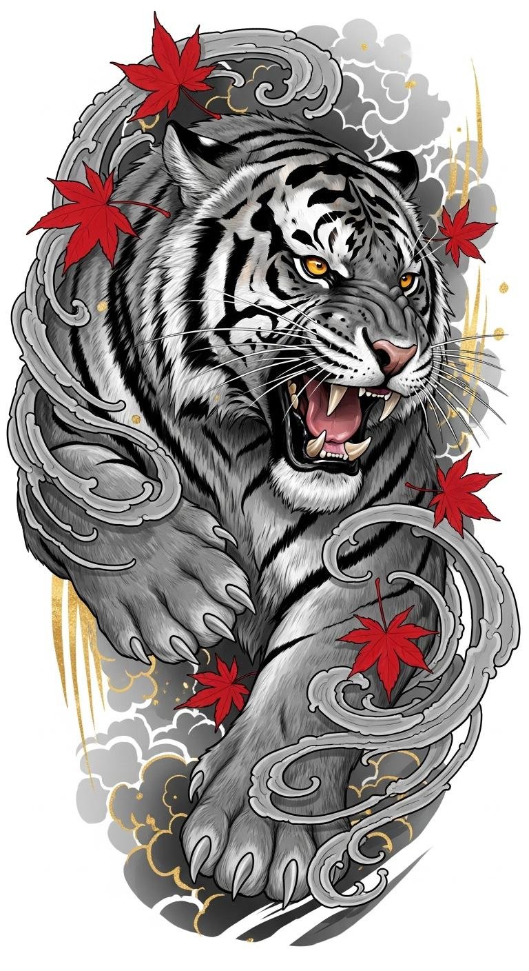 This design channels the tiger’s raw intensity and protective energy: the roar conveys assertiveness, the wind and maple leaves imply movement and seasonal change, and the gold brushstrokes add a hint of honor and resilience.