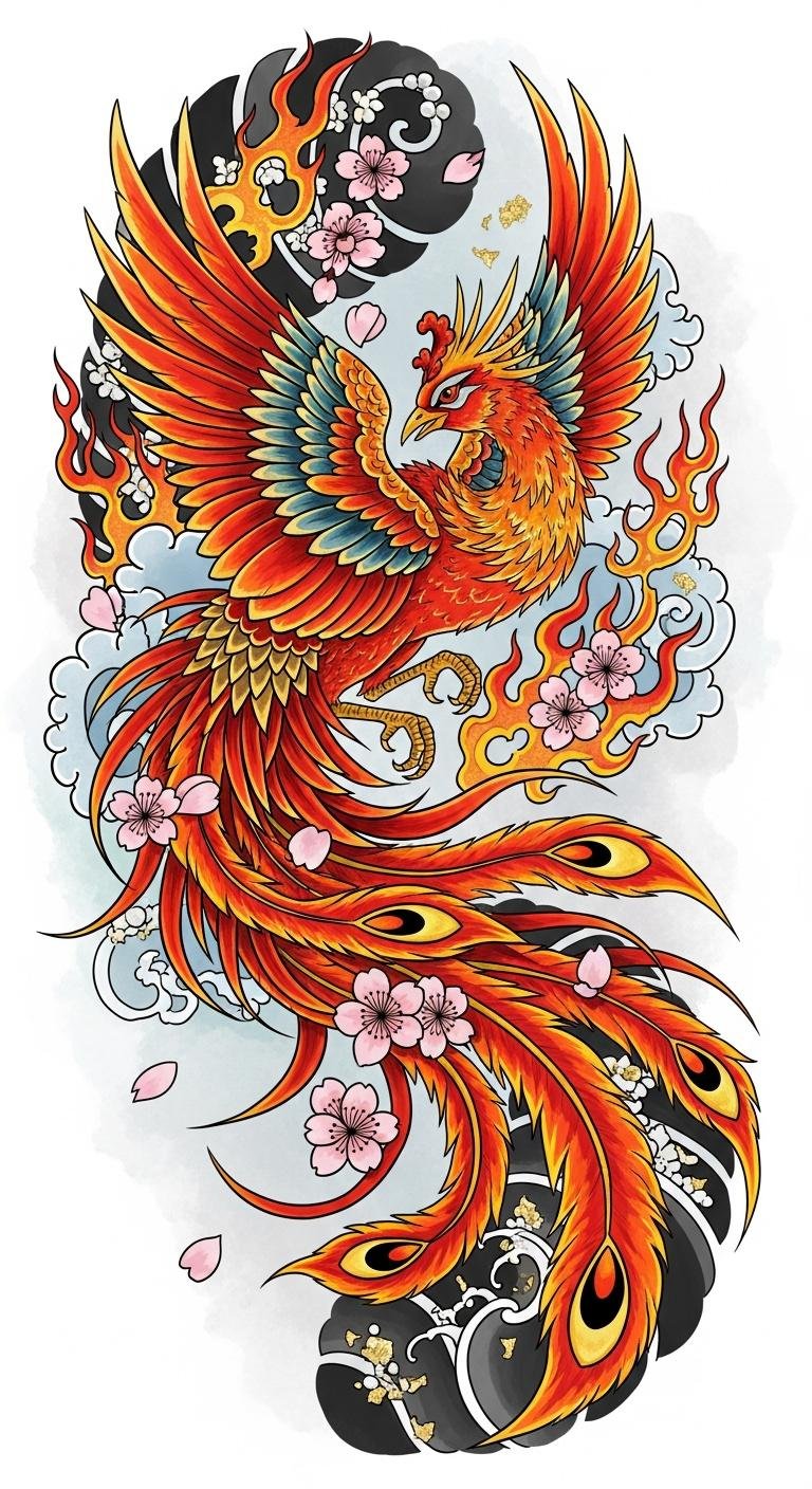The design conveys resilience and renewal—fiery energy paired with graceful motion evokes emotional catharsis and hope; ideal placement is across the back or wrapped as a full sleeve to allow the sweeping tail and flames to flow with body contours, with cherry blossoms softening the intensity and gold accents highlighting focal points.