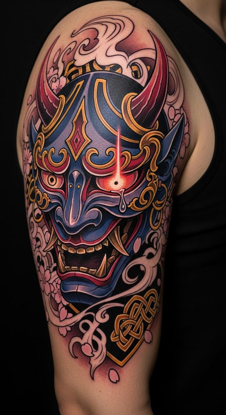 This placement on the upper arm wrapping toward the shoulder allows the layered elements—teardrop, blaze, sakura petals—to read from multiple angles, emphasizing the mask’s duality of menace and vulnerability; the gold filigree and knotwork anchor the image as protective ornamentation while the smoke-sakura transition symbolizes catharsis and renewal.