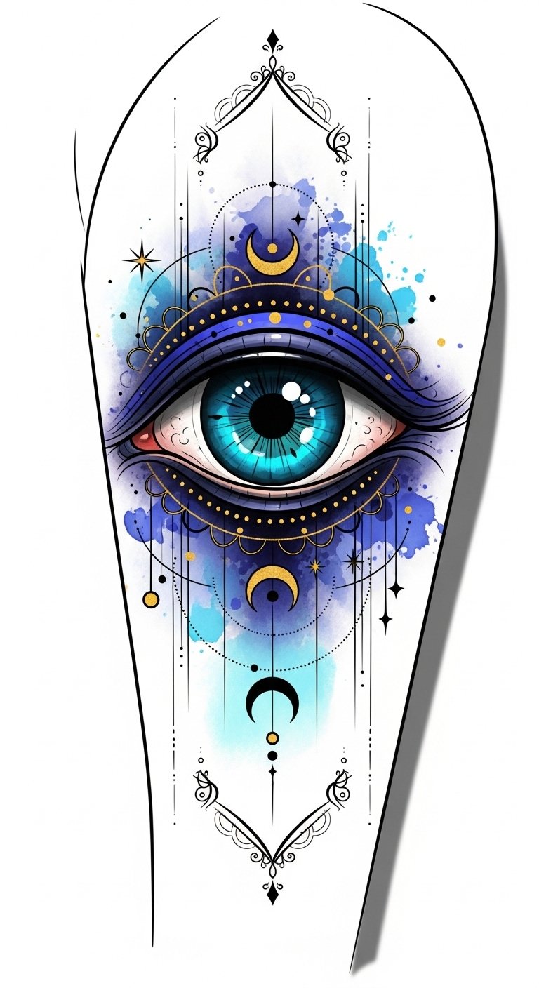 The design combines the protective power of the Turkish Eye with ornamental and celestial motifs to emphasize resilience and freedom; the cool blues convey calm and warding energy while gold accents suggest value and inner strength, evoking a quiet confidence and emotional safeguard.