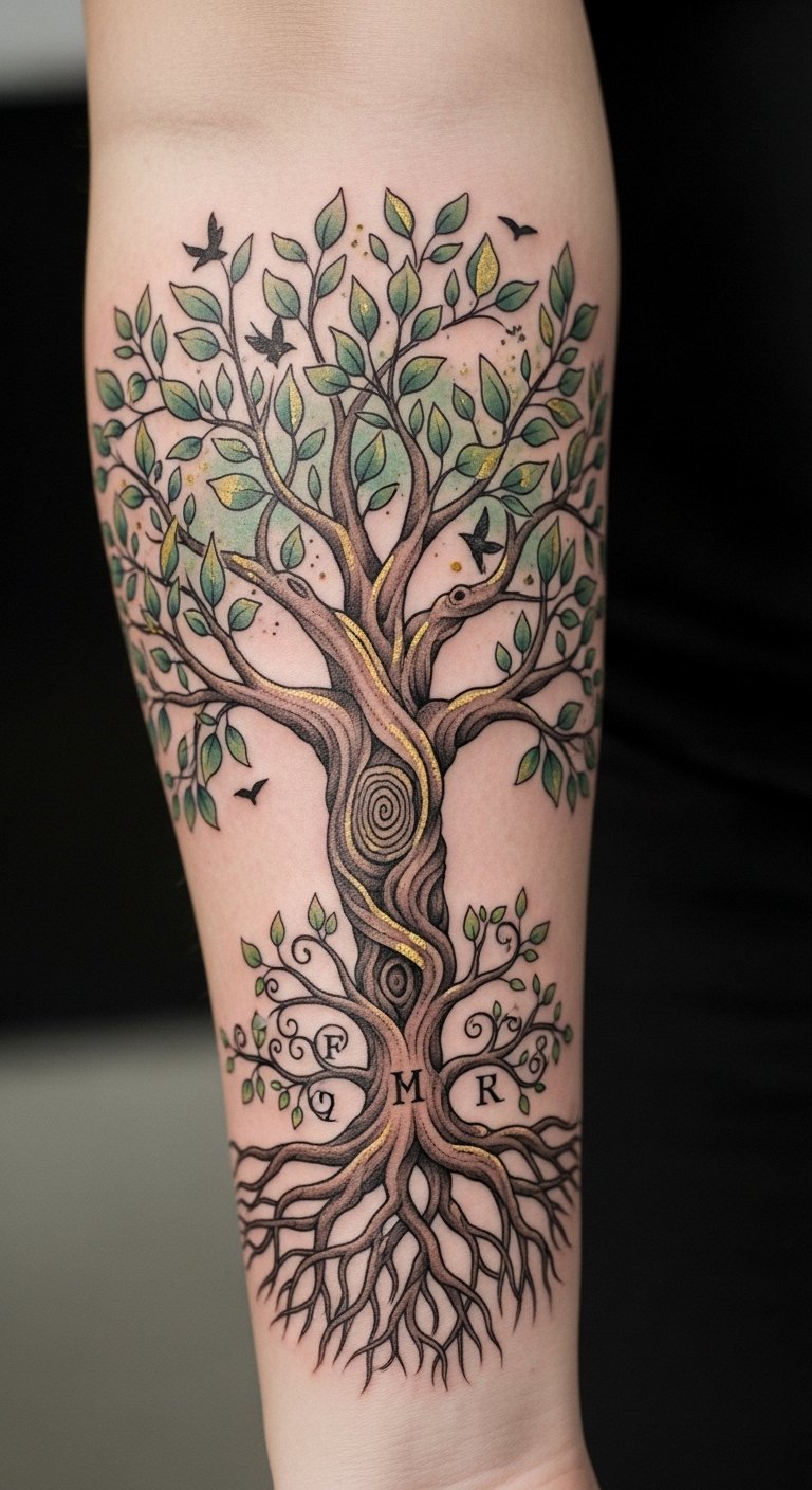 Symbolically the carved initials and intertwining roots emphasize lineage and permanence, the birds and upward branches convey hope and personal growth, and the watercolor accents add warmth and memory.