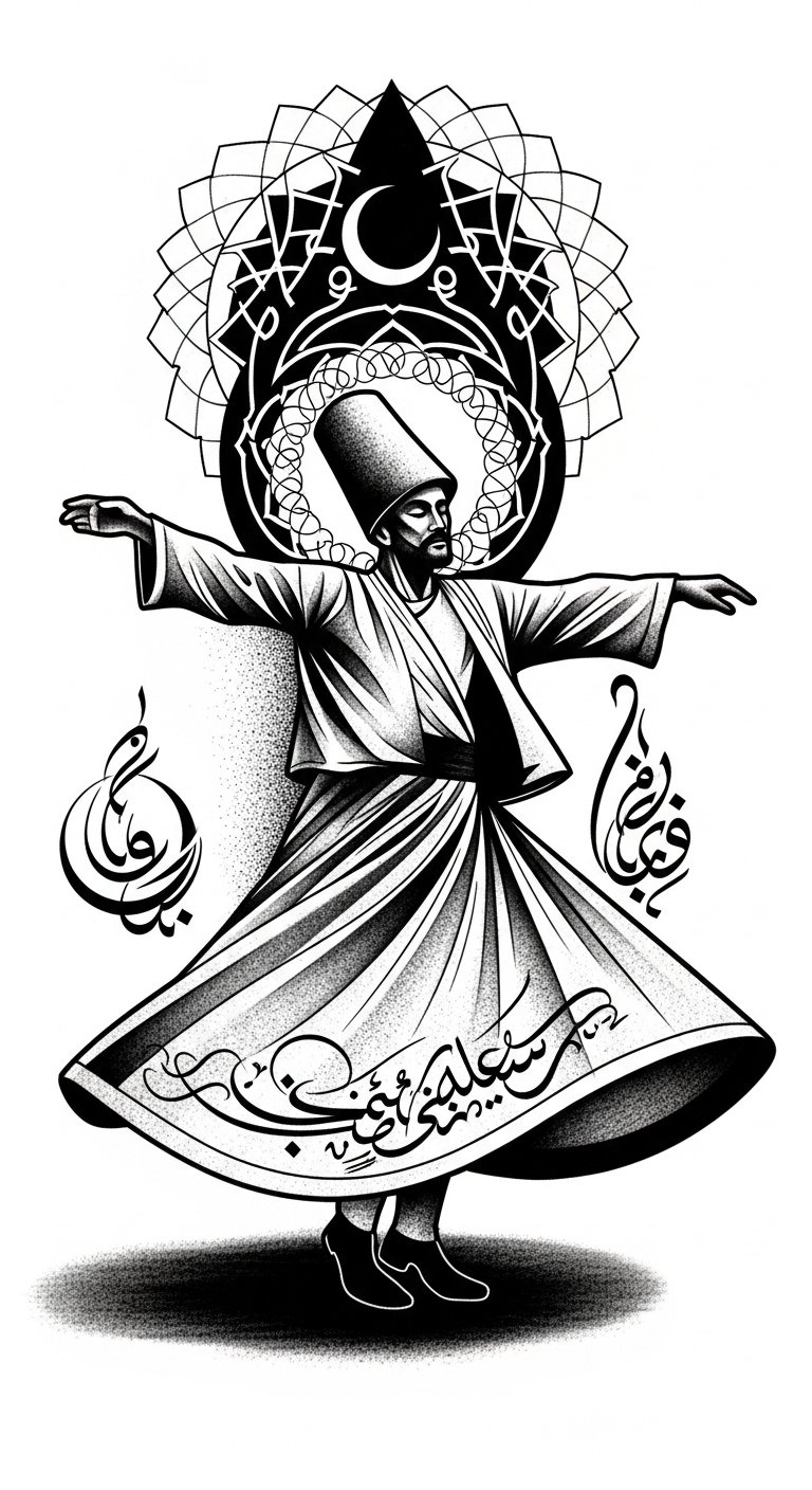 As you consider a tattoo, envision the swirling robes and vibrant energy, capturing your quest for freedom and inner peace, inspiring you to embrace your own spiritual journey. The design marries motion and stillness—spiraling robes suggesting ongoing transformation, gold and turquoise highlights for divine light and tranquility, calligraphic echoes linking tradition and personal meaning.