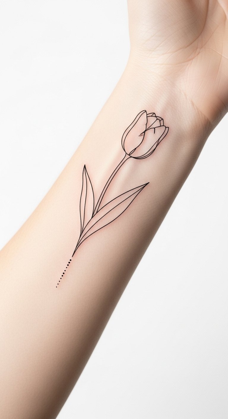 A fine-line tulip tattoo embodies elegance through its delicate simplicity, capturing the beauty of nature in a minimalist form.