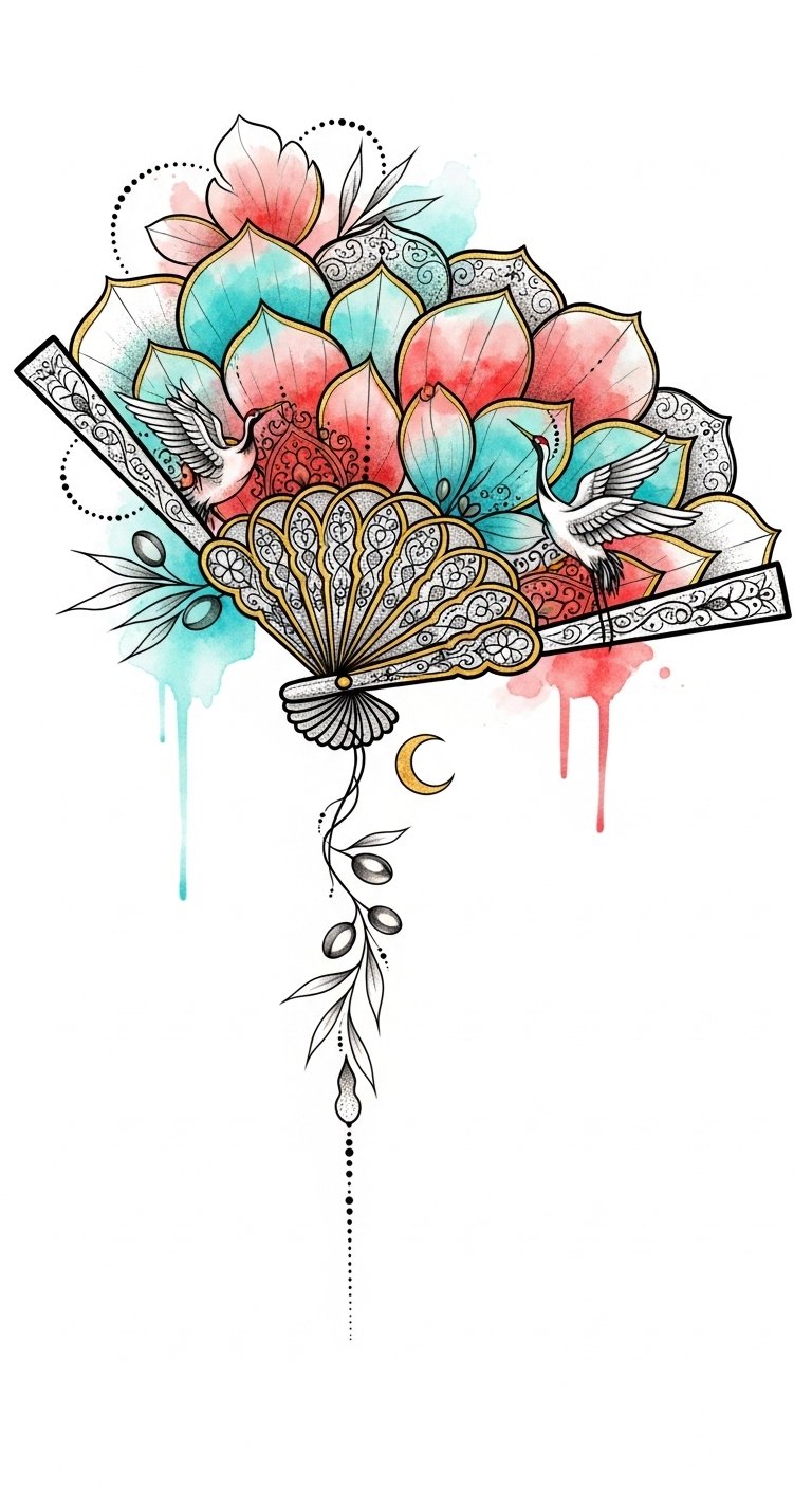 Each curve and detail tells a story, inviting you to celebrate life’s fleeting moments while expressing your passion for the serene artistry of nature. This design pairs emotive watercolor tones with precise linework to balance delicacy and permanence; cranes and olive branches symbolize peace and continuity, the crescent moon adds quiet introspection, and placement along the upper back or ribcage allows the fan’s sweep to move naturally with the body, enhancing both visual flow and personal meaning.