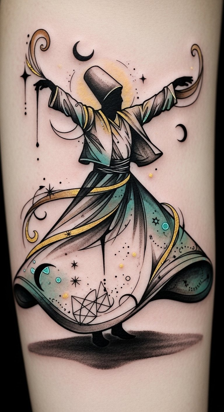 Each design can evoke a sense of transcendence, inviting onlookers to explore deeper meanings. Let your tattoo be a unique interpretation of this timeless dance of life. The design symbolizes inner journey and surrender — the robes-as-ribbons imply release from ego, the moons and stars hint at cosmic connection, and the calligraphic strokes suggest voice and story; emotionally it conveys serenity, devotion, and kinetic joy.
