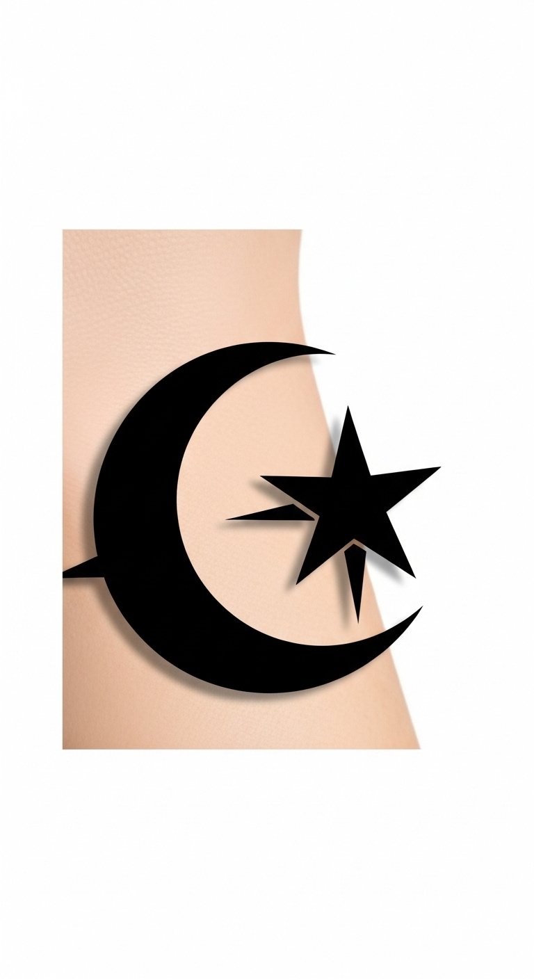 As the night sky unfolds, a crescent moon and star tattoo in a striking black silhouette emerges as a modern statement of elegance and mystique.