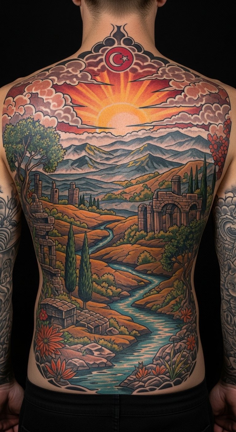 Building on the striking imagery of the Turkish wolf, consider an elaborate back piece that captures the breathtaking landscapes of Turkey.