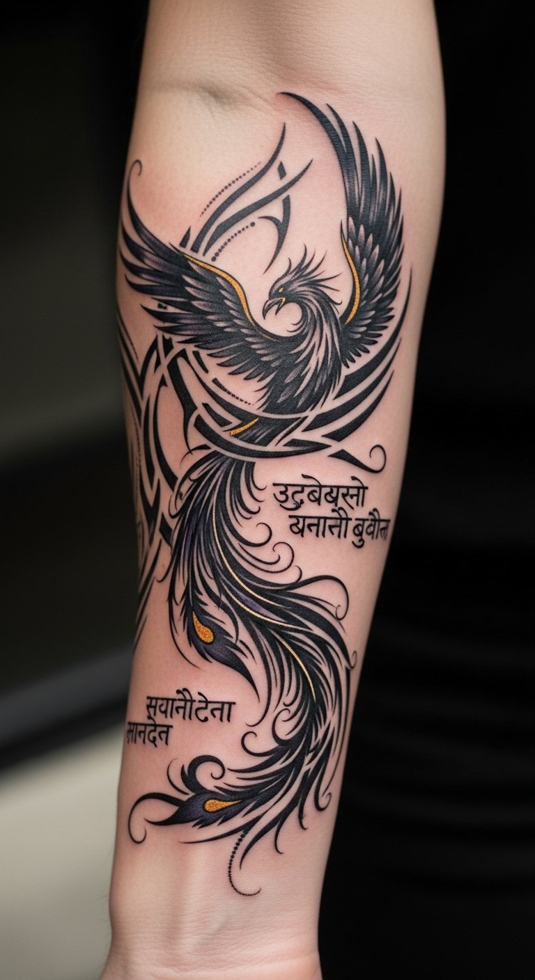 The phoenix represents rebirth and resilience, the tribal knotwork ties the design to ancestral roots, and the native script personalizes the message; together they evoke pride, empowerment, and openness.