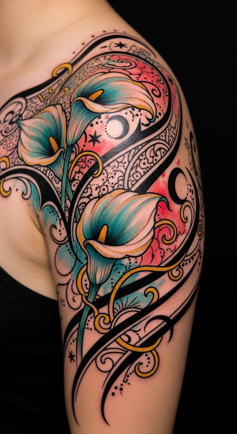 Embrace vibrant colors and bold lines, as they embody your spirit and freedom, transforming tattoo aesthetics into a personal masterpiece that tells your story. This design symbolizes growth and resilience (calla lilies), guided aspirations (stars and crescent), and the balance between strength and grace (filigree and negative space); emotionally it evokes confidence and liberation, while the placement along the deltoid and wrapping toward the clavicle ensures the artwork accentuates muscular movement and remains visible or easily concealed depending on clothing.