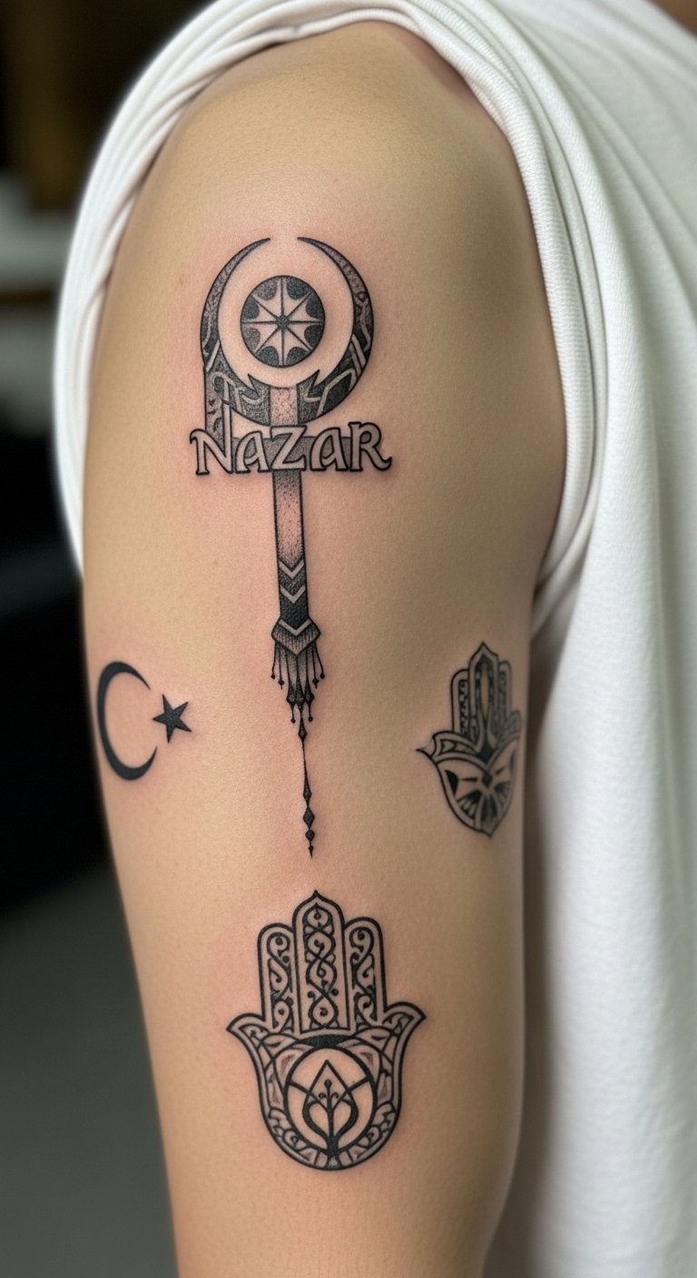 This design places a central stylized Nazar eye over a softly curved Hamsa hand, woven with Ottoman floral motifs and geometric tessellations that follow the natural taper of the upper arm; shading is delicate, with fine-line filigree and small dotwork accents to evoke both resilience and grace. Symbolically it combines protection (Nazar) and blessing (Hamsa) with cultural heritage (Turkish patterns), creating an emotional balance of defense and self-expression; ideal placement wraps slightly on the outer biceps so the piece reads from the shoulder toward the elbow, offering visibility and personal intimacy.