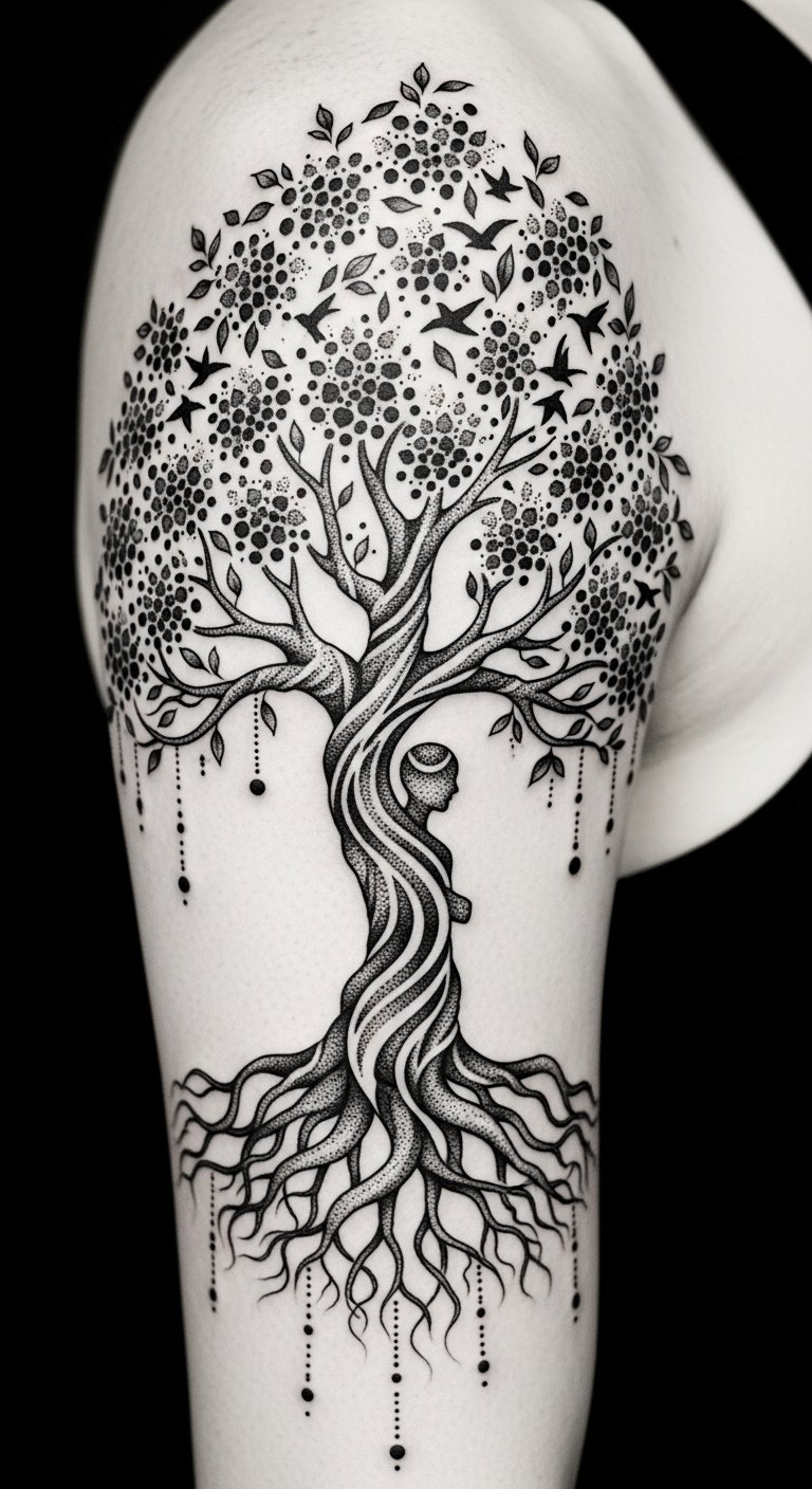 The Dotwork Tree of Life tattoo embodies a fascinating blend of nature’s intricacies and personal growth, making it a striking choice for those who cherish connection and meaning.