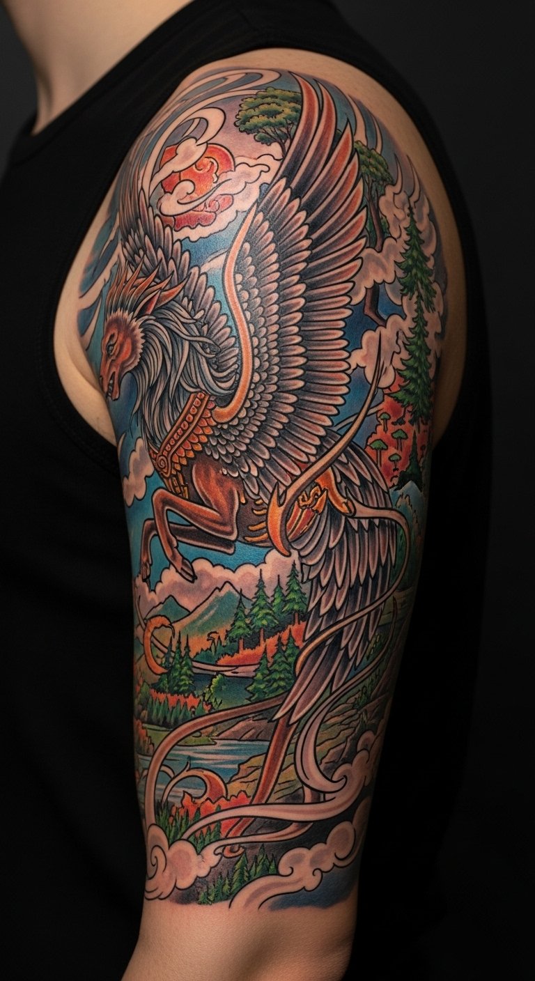 This design blends a stylized phoenix with Anatolian motifs—feathers flowing into tulip and cypress patterns, mountains and the sea hinted in watercolor washes—evoking rebirth, resilience, and the bond between humanity and nature; emotionally it inspires empowerment and serene connection, suitable for a shoulder-to-chest piece that follows musculature for movement, or a full-back composition that lets the landscape and creatures breathe and interact.