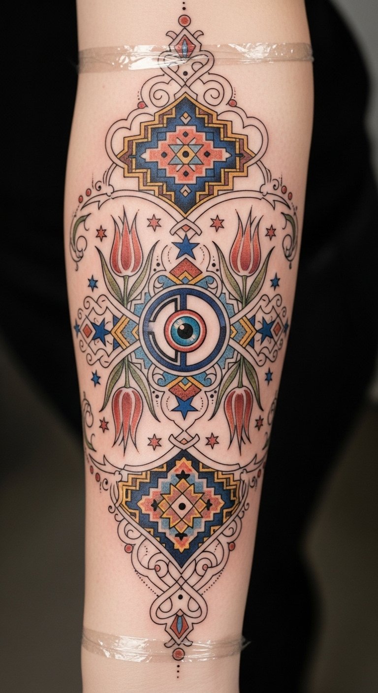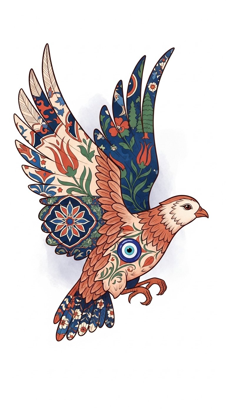 By choosing symbols that resonate with you, you honor the stories of your ancestors while embracing your unique journey. Let your ink tell a tale that’s authentically yours. The design combines Anatolian tile geometry and botanical motifs to evoke continuity and growth; the Nazar at the heart offers protection and watchfulness, while the bird in flight conveys liberation and forward movement.