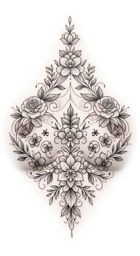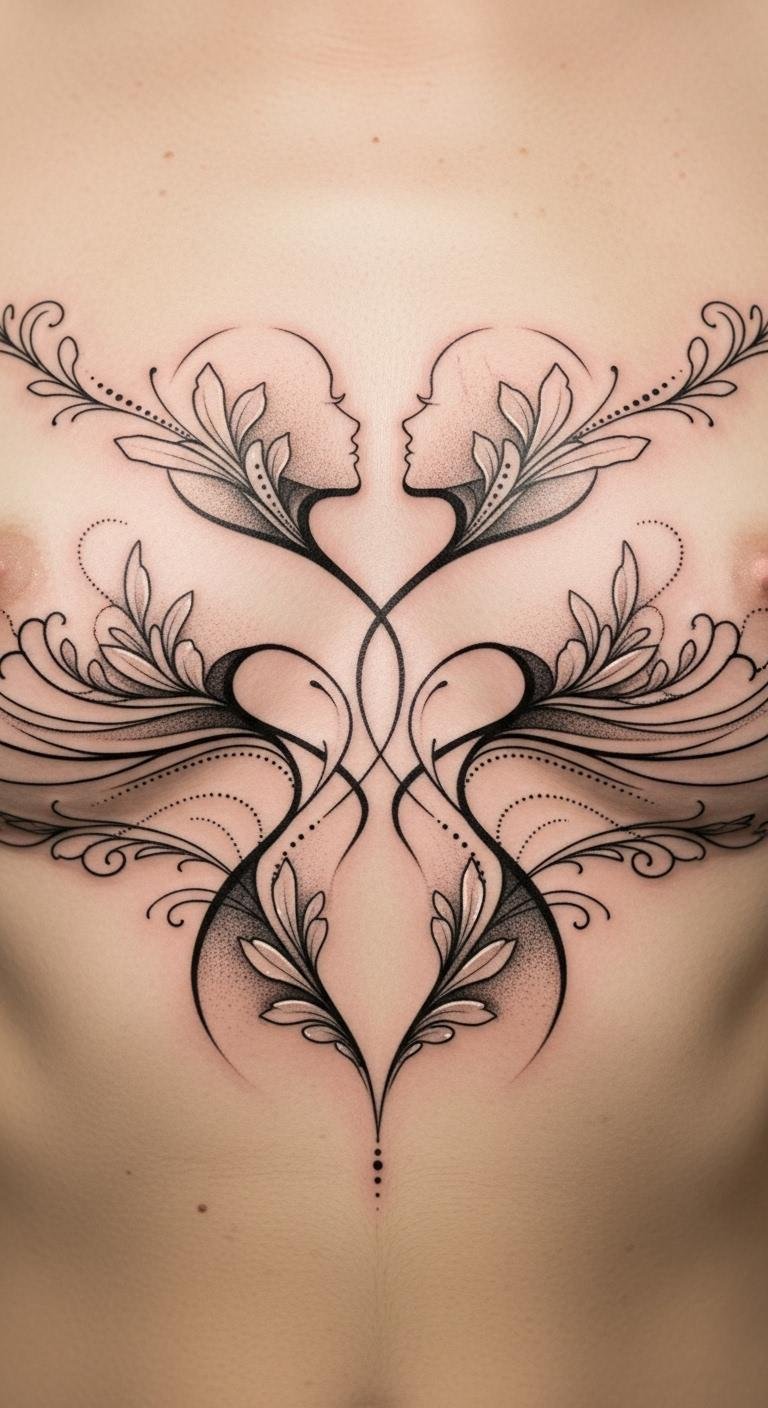 The placement under the bust accentuates natural contours and feels intimate and empowering; the intertwined profiles and floral negative space symbolize connection, growth, and resilience, while the delicate filigree and dotwork evoke elegance and softness, inviting both private reflection and outward celebration.