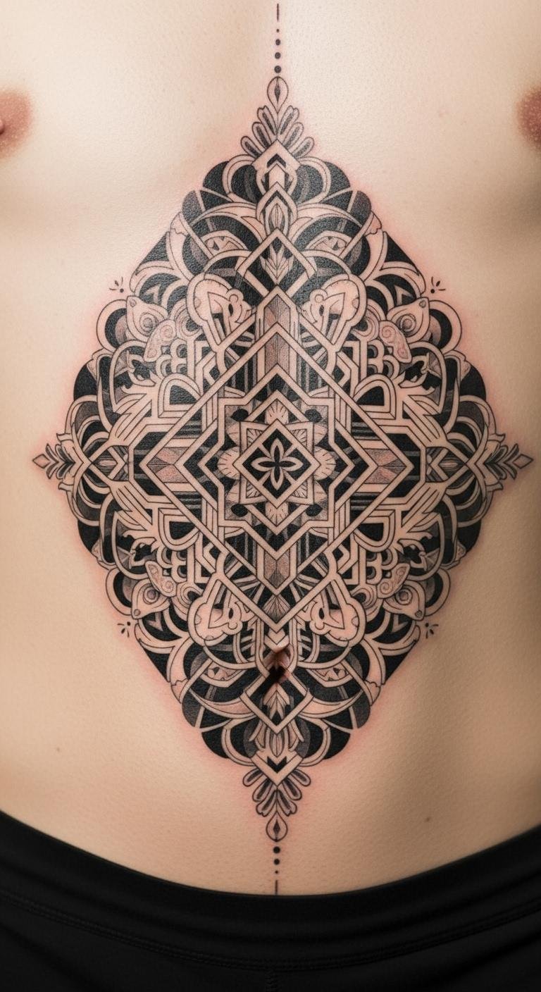 Geometric underboob design featuring layered mandala cores, mirrored triangular lattices, fine dotwork shading, crisp negative-space crescent arcs hugging the sternum, and thin ornamental filigree extending toward the ribs; rendered in black and dark gray ink with subtle white highlights, scale optimized for curvature and breath, high-contrast clean lines for comfortable healing.