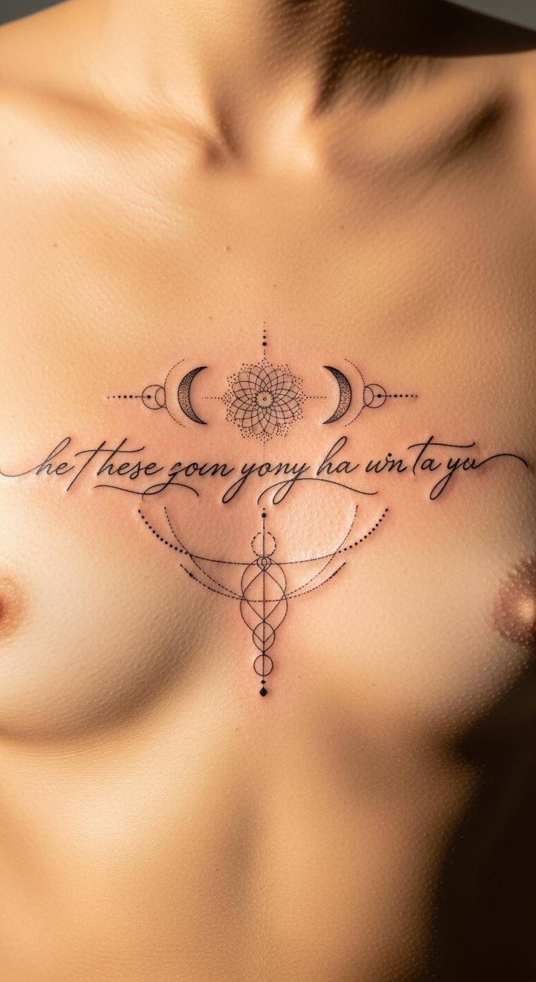 The design places the inked personal affirmations along the natural curve beneath the breasts, integrating small geometric elements to balance softness and structure; symbolically the script affirms inner strength while the mandala and crescents evoke wholeness and cyclical growth, creating an intimate emotional anchor that reads as both private reminder and visible celebration.