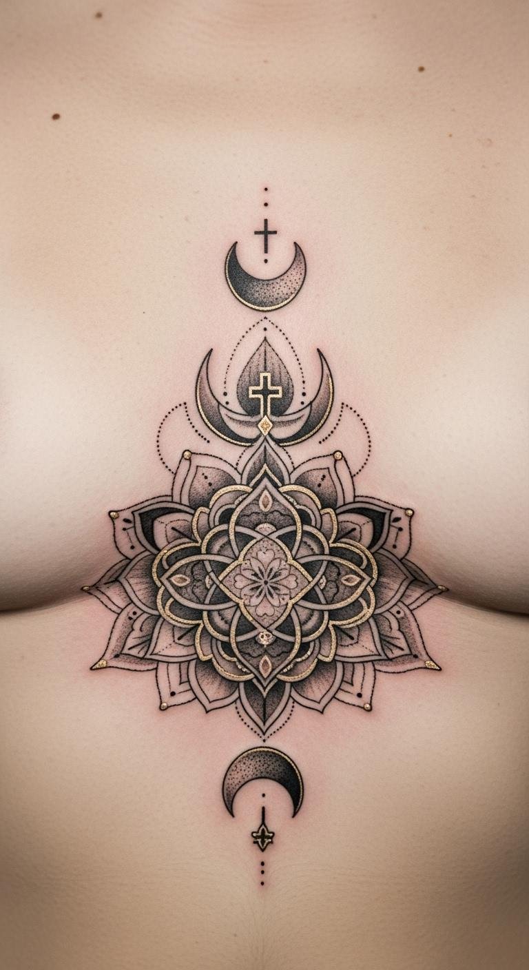 The mandala’s concentric layers represent personal growth and centeredness, while the crescent accents nod to intuition and cycles; placed beneath the breast following the natural rib curve, the design feels intimate and empowering, evoking calm confidence and a continual reminder to live authentically.