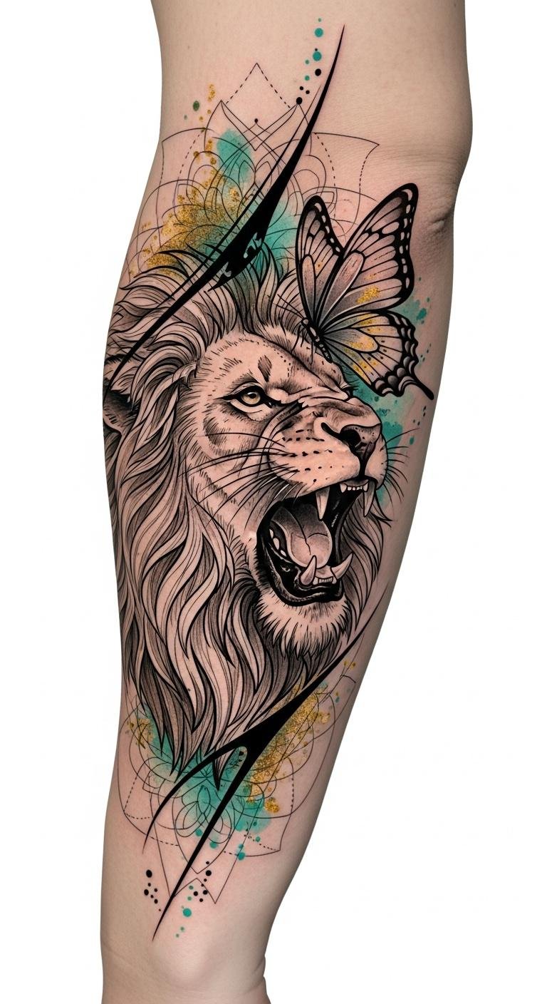 This design merges the lion’s courage and leadership with the butterfly’s transformation and delicacy, evoking resilience softened by hope; ideal for the upper arm or forearm where the curve of muscle enhances flow, placed so the lion faces forward and the butterfly sits near the inner bicep for a personal, intimate reminder.
