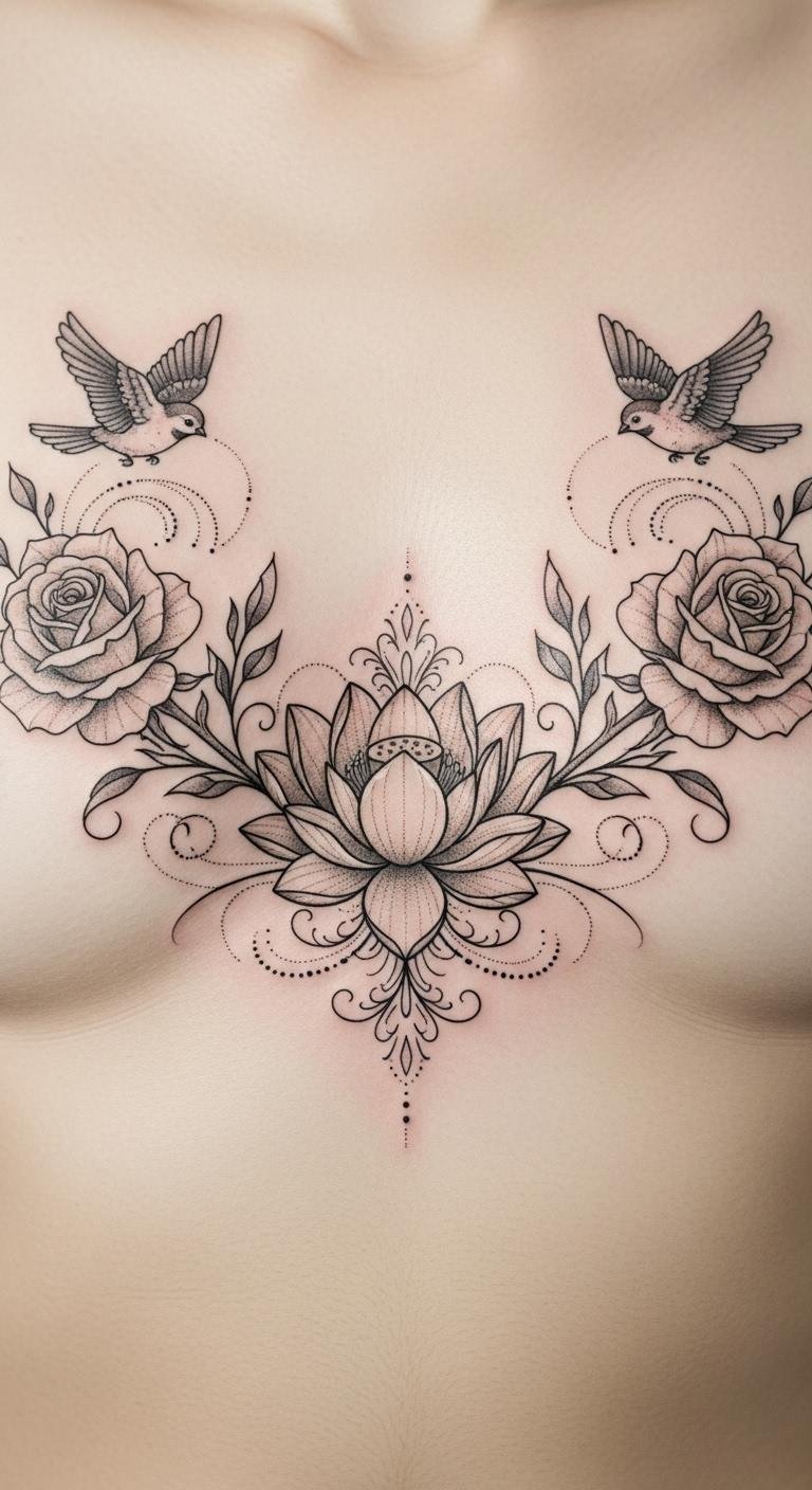 Let your tattoo be a constant reminder to embrace your evolving spirit and limitless potential. The lotus and roses symbolize rebirth and layered personal growth, while the ascending birds convey liberation and forward movement; fine-line details and placement under the breasts make it intimate and empowering, visible to you and revealed on your terms, evoking quiet confidence and continuous transformation.