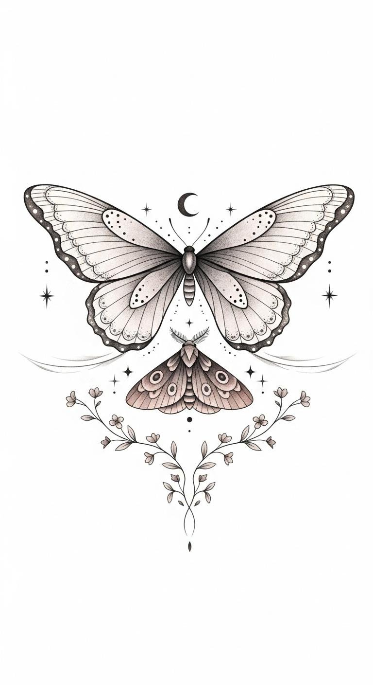 This placement emphasizes intimacy and personal significance—positioned beneath the breast it follows natural curves to feel like an adornment rather than an emblem. The butterfly and moth facing each other represent balance between outward transformation and inner knowing; fine lines and soft shading keep the piece ethereal and tender, invoking hope, resilience, and quiet confidence.