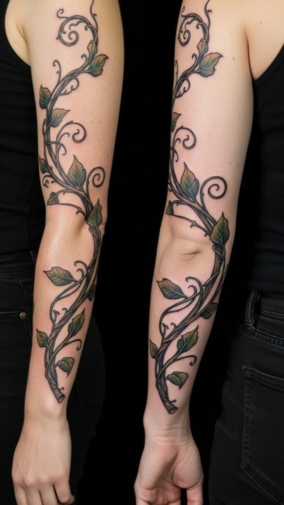 Using wrap around techniques, these tattoos elegantly flow along your skin, symbolizing growth and freedom. Each vine tells a story of resilience and connection, making it a powerful choice.