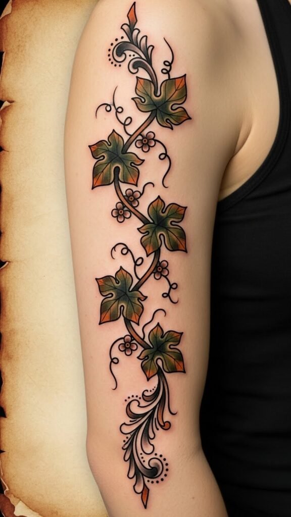 Realistic vine tattoos evoke growth, resilience, and connection to the natural world; their flowing lines suggest movement and freedom while the detailed shading lends depth and a sense of life.