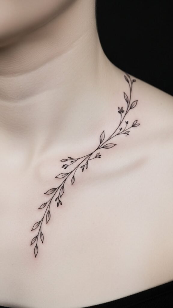 Popular fineline vine placements, like the collarbone or ankle, enhance their charm. Each vine carries deep fineline vine symbolism, representing growth, resilience, and connection to nature—perfect for your next ink adventure!