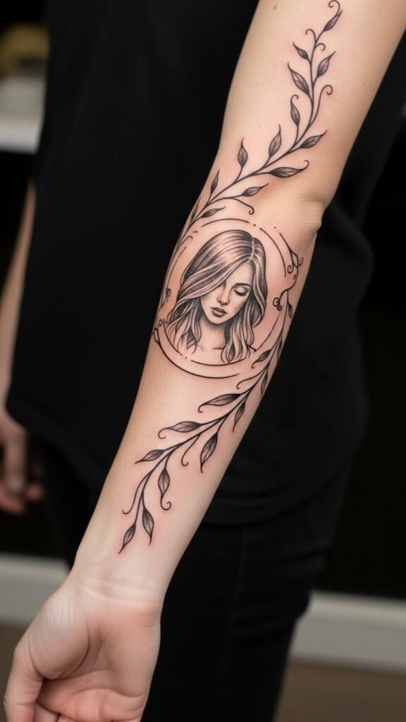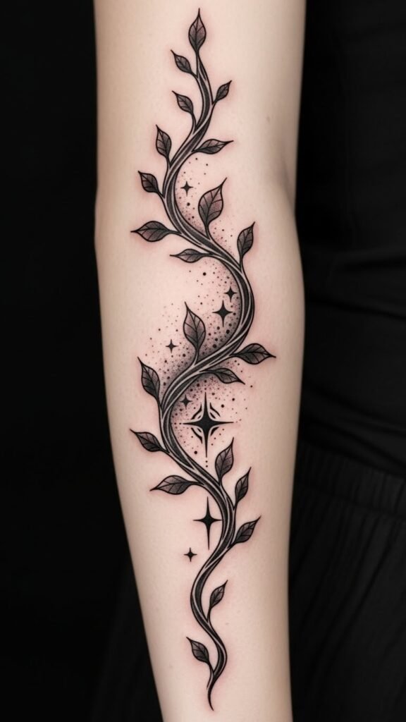 This design concept places a graceful vine along the forearm, starting near the wrist and spiraling gently toward the inner elbow, with thin tendrils, small leaves, and occasional tiny blossoms to convey growth and renewal; the symbolism emphasizes resilience, freedom, and personal evolution, evoking calm determination and hope, and the placement allows the vine to wrap naturally with the arm’s contours so each movement reveals a different aspect of the visual narrative, making it both intimate and visible depending on sleeve or posture.