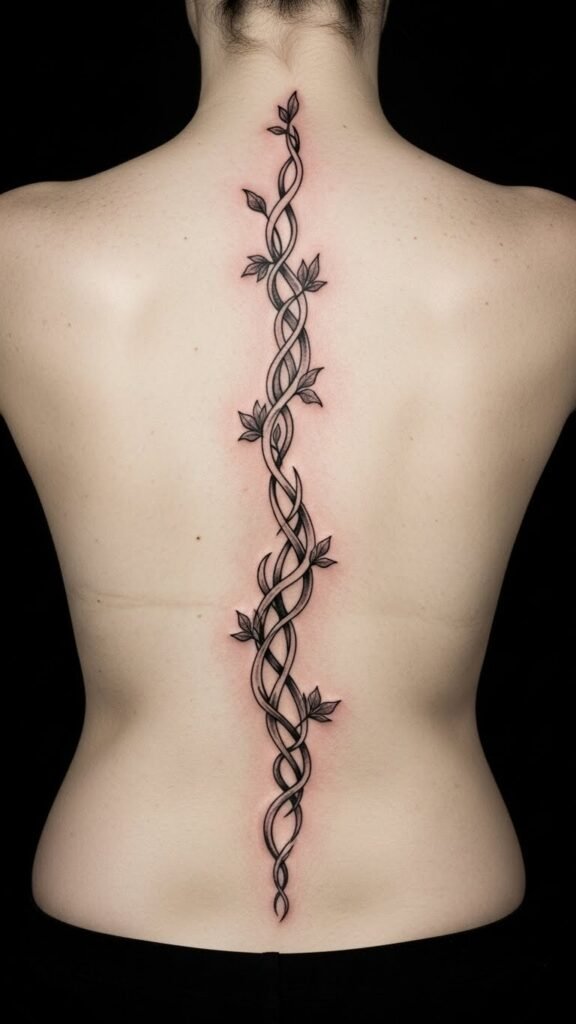 Vine tattoos along the spine evoke a deep sense of personal evolution—each leaf and tendril marking stages of growth and the resilience required to move forward.