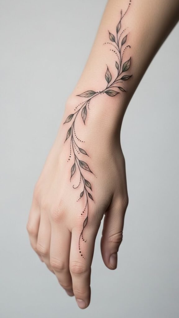 Ideal hand vine placement allows for visibility, inviting admiration and sparking conversations. Choose designs that resonate with you, celebrating your unique story through stunning ink. The design evokes themes of personal growth, interconnectedness, and gentle resilience; delicate leaves and tiny blossoms suggest ongoing renewal while the vine’s movement across fingers and palm conveys a living thread between self and world.