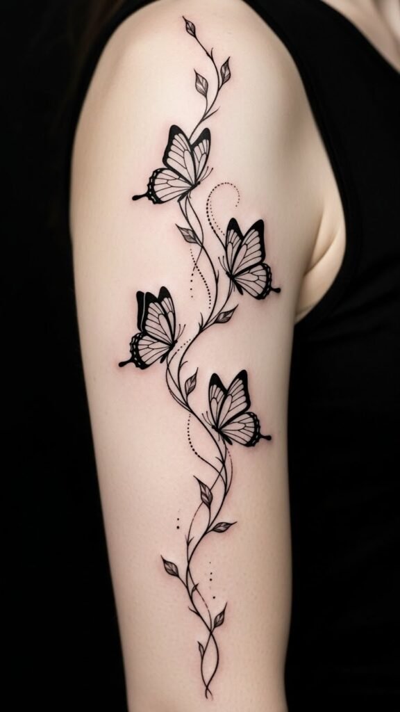 Emotionally it speaks to personal growth, gentle strength, and joyful release; ideal placements include the forearm, ribcage, shoulder blade, or ankle where the vines can flow with the body’s contours and allow the butterflies to appear in flight.