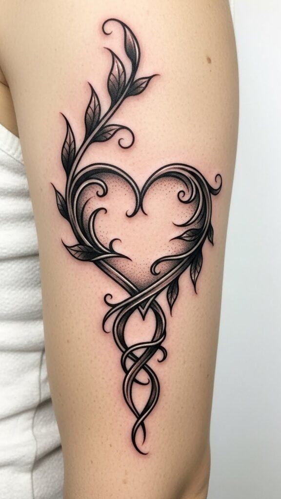 This concept pairs delicate, winding vines with a central heart, rendered in fine line or soft watercolor, to symbolize growth, resilience, passion and intimacy all at once; place it over the ribcage or along the forearm to follow the body’s natural movement, where the intertwining vines suggest an ongoing journey through hardship and celebration, evoking openness, freedom, and a quietly adventurous spirit.