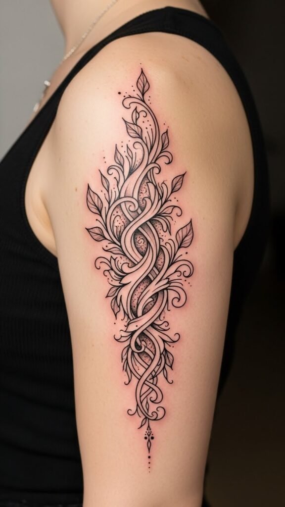 Emotionally, the piece can signify healing, continuity, and the beauty of interconnected experiences; visually, varying line weights and subtle shading create movement that feels alive against the skin, while small blooms or thorns can be added to reflect moments of triumph or challenge.