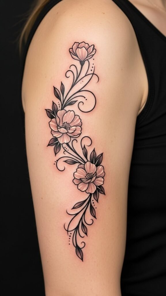 Delicate vines weave upward and around the forearm or along the ribcage, punctuated by clustered blooms that each reflect love, hope, or resilience; use fine lines for the vines and soft shading for petals to evoke movement and openness.