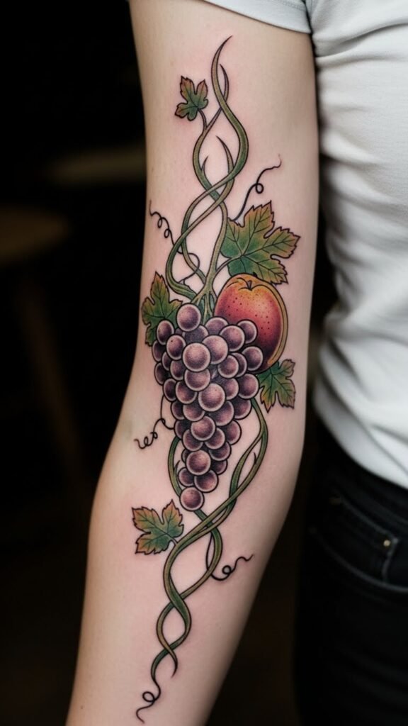 As nature’s bounty and personal narrative converge, this design concept channels abundance and energy through cascading grapevines that flow organically along the forearm or shoulder blade; clusters of grapes nestle among winding tendrils, creating movement and balance that evoke joy, prosperity, freedom, and growth.