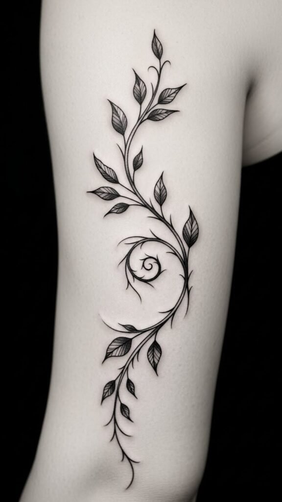 These tattoos embody monochrome vine symbolism, reflecting resilience and connection through their graceful curves.