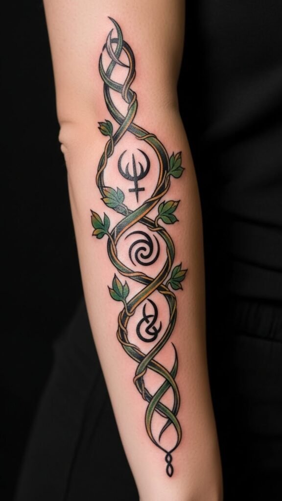 This design concept pairs winding, organic vines with carefully chosen symbols—small lockets, stars, runes, or cultural motifs—woven into the tendrils to tell a personal narrative; use flowing linework with selective color accents (deep greens, muted golds, or jewel tones) to highlight key symbols and create emotional focal points; ideal placements include the forearm wrapping toward the wrist, along the clavicle sweeping to the shoulder, or encircling the ankle, where movement emphasizes growth, resilience, and the wearer’s journey toward freedom.