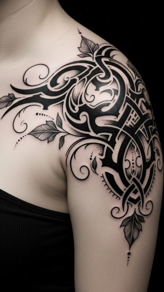 Consider placement along the shoulder wrapping across the chest or down the forearm to emphasize natural flow; the bold tribal lines convey resilience while the vine elements suggest personal growth and continuous change, evoking a sense of rootedness and liberated motion.