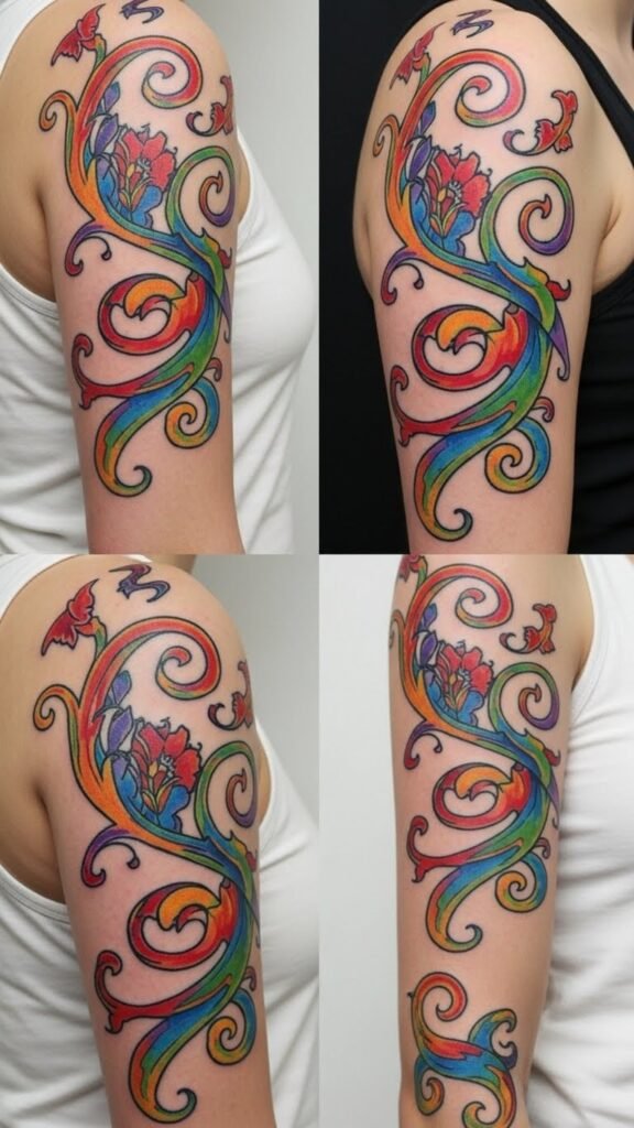 Symbolically this design represents growth, resilience, and personal celebration—each color reflecting facets of individuality and emotional richness—evoking joy, confidence, and a sense of continuous renewal; ideal placements follow natural curves (shoulder to collarbone, around the forearm, wrapping the thigh or waist) so the vine’s dance accentuates the wearer’s form and invites viewing as an intimate, living artwork.