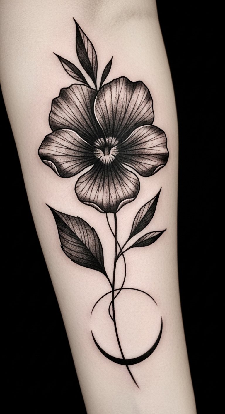 Realistic violet flower tattoos offer a vibrant celebration of nature, but black violet tattoo concepts take a different approach, embracing a more enigmatic and bold aesthetic. These designs capture black violet symbolism, representing mystery and strength. You can explore various black violet styles, from intricate linework to minimalist silhouettes, allowing your creativity to flourish while making a powerful statement about your individuality. The design emphasizes mystery and resilience—black ink conveys depth and permanence while the subtle gray shading adds softness and dimension; place the tattoo on the inner forearm or upper back where the curved crescent can follow natural contours, invoking quiet strength and personal introspection.