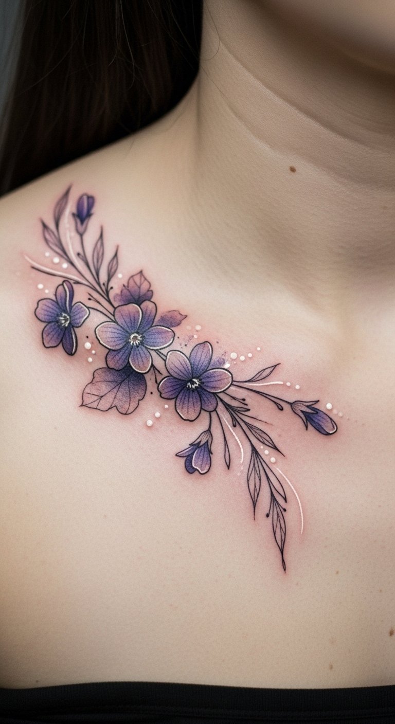 Violet tattoos aren’t just limited to the wrist; they can also grace the collarbone with an air of sophistication and allure. This placement embodies collarbone elegance, accentuating your neckline beautifully.