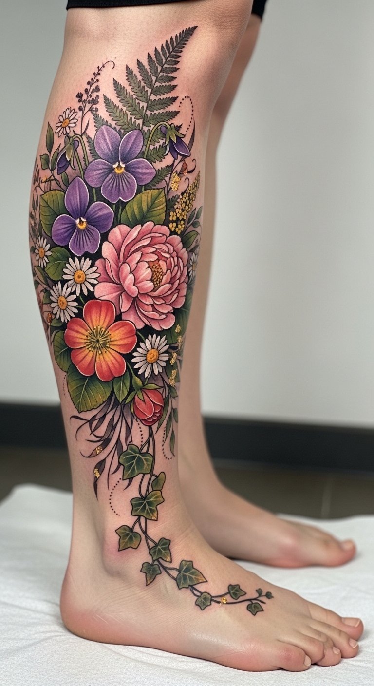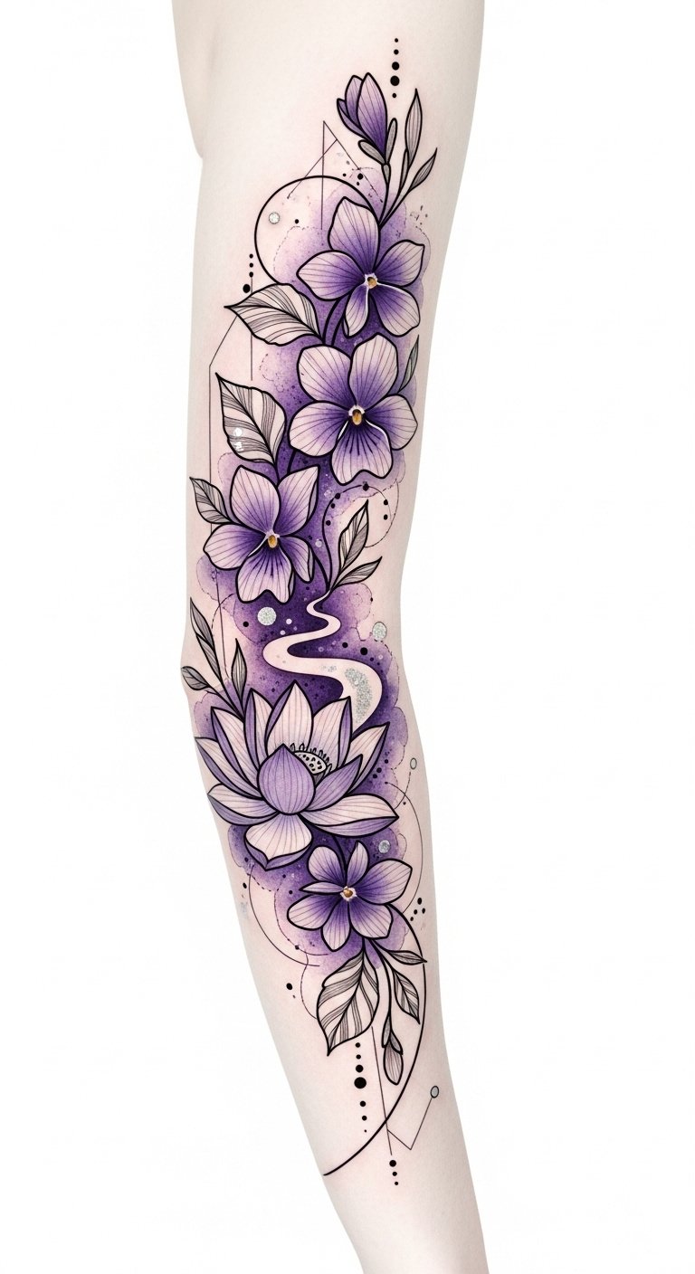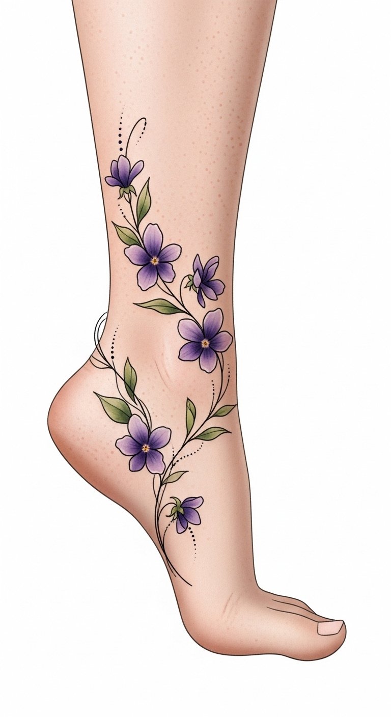 Imagine intricate vines curling around your ankle, vibrant violets blooming, exuding a sense of freedom.