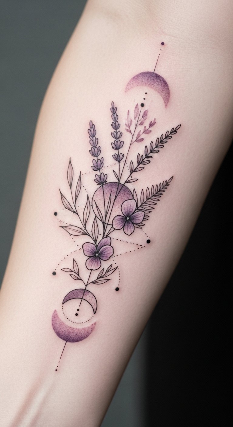 These muted violet aesthetics evoke tranquility, allowing your creativity to bloom freely. Each tattoo becomes a canvas, expressing your unique journey through delicate shades of violet. The design blends botanical motifs and gentle geometry to symbolize growth, balance, and introspective calm; placed along the inner forearm it offers a personal, visible reminder of resilience and quiet elegance while the muted tones keep the emotional expression subtle and timeless.