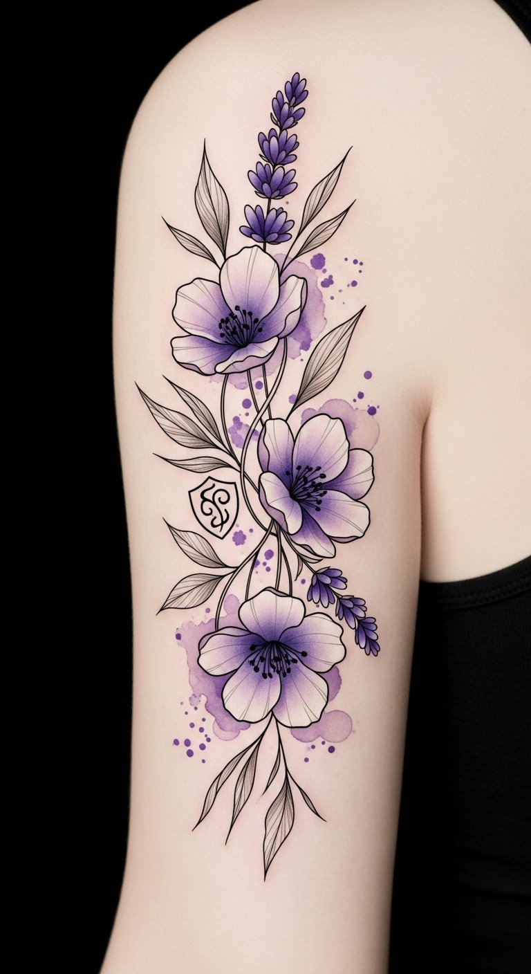 When you embrace a lavender violet tattoo, you’re not just expressing beauty; you’re channeling a legacy of peace, creativity, and deep emotional connection. This design emphasizes tranquility and intimate emotion—its soft purples and tucked sigil suggest quiet protection and inner wisdom.