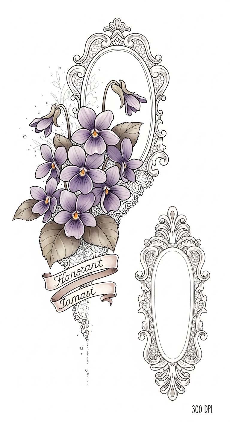 These tattoos capture the essence of Victorian symbolism, inviting you to express your personality while celebrating the timeless charm of this enchanting era. The violets symbolize modesty and lasting affection, the lace filigree and scrollwork evoke nostalgia and refinement, and the softly muted palette conveys tenderness and quiet strength;