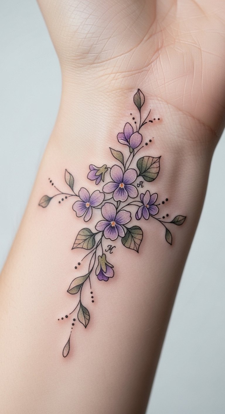The intertwined violets and hidden initials symbolize connection and memory, the soft watercolor and fine lines convey tenderness and vulnerability, and placement on the wrist, inner forearm, shoulder blade, or behind the ear allows for both private reflection and visible reminders of love.