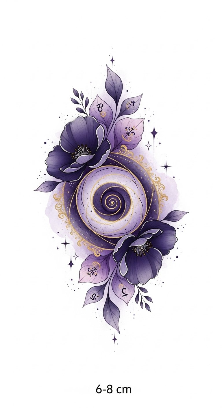 Let your creativity flow, blending colors and styles to create a tattoo that’s not just art, but a vibrant expression of who you truly are. This design symbolizes the balance between inner wisdom (the central spiral) and emotional depth (violet petals), with gold filigree and stars adding a sense of aspiration and luminosity; emotionally it evokes calm, introspection, and gentle empowerment.