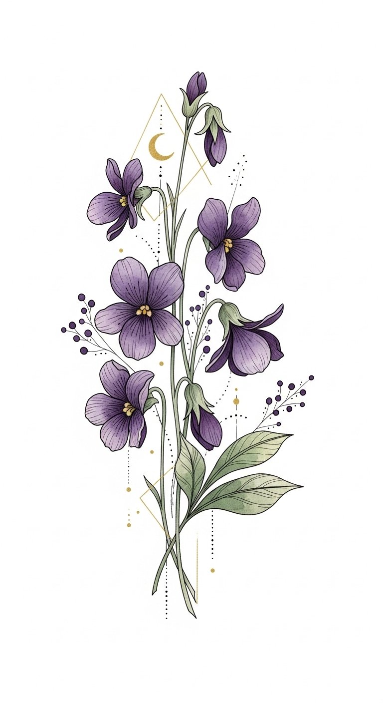 This tattoo concept uses the original text’s imagery to symbolize love, loyalty, and creative freedom: the cluster of violets represents connected relationships and personal growth, the crescent moon and geometric gold lines suggest guidance and balance, and the stippling adds intimacy and texture.