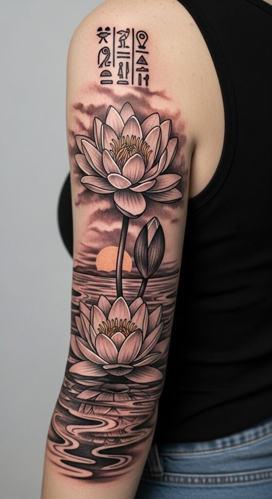 This design emphasizes renewal and spiritual uplift through the dawn light and Egyptian motifs; it evokes calm, introspection, and dignity. Ideal for a forearm or upper back placement where the vertical bloom and reflective water flow complement body contours and allow the symbolic details to be appreciated up close.