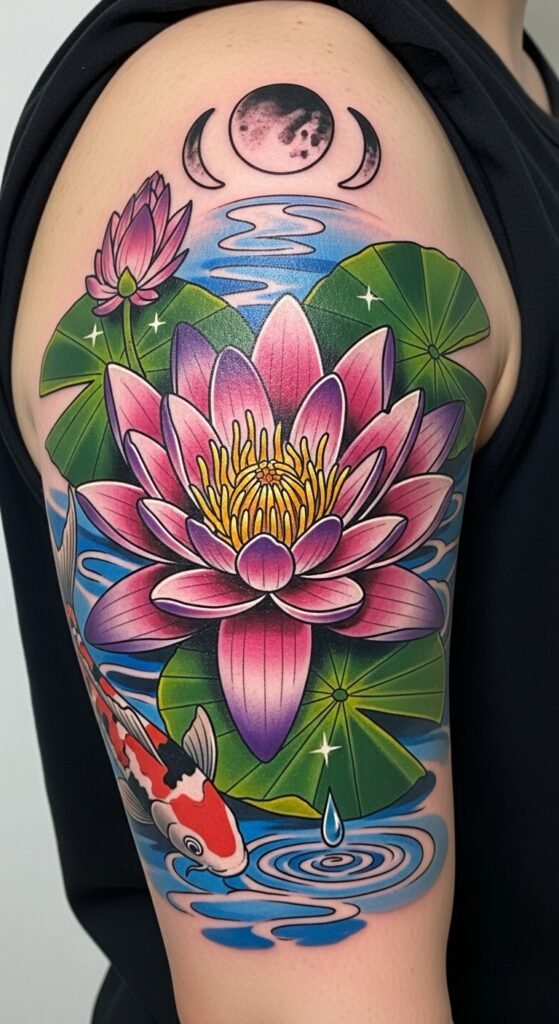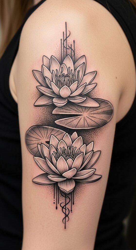 This design concept merges multiple stylistic elements—bold traditional outlines for the main bloom, fine-line detailing for inner petals, and subtle geometric shading around the lily pad—to symbolize balance between strength and fragility. Emotionally it evokes serenity, self-expression, and a timeless connection to nature; use soft color washes (emerald greens, blush pinks, pale blues) to enhance calm and warmth. Ideal placements include the upper arm or shoulder for a medium-sized piece, the ribcage for a more intimate tattoo, or along the side of the calf for vertical flow, allowing the composition’s contrasts to read clearly from different angles.